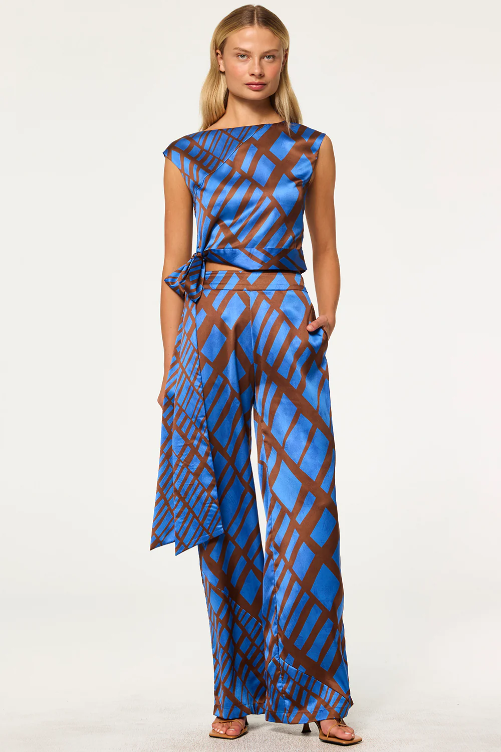 Abbi is a chic sleeveless top with a flattering boatneck cut, crafted from a vibrant blue and brown Matrix-printed satin that plays with pattern and scale. Its cropped silhouette is perfectly fitted and finished with a built-in side tie belt for an effortlessly cinched waist. Pair it with the coordinating Ilana pant for a striking head-to-toe look.