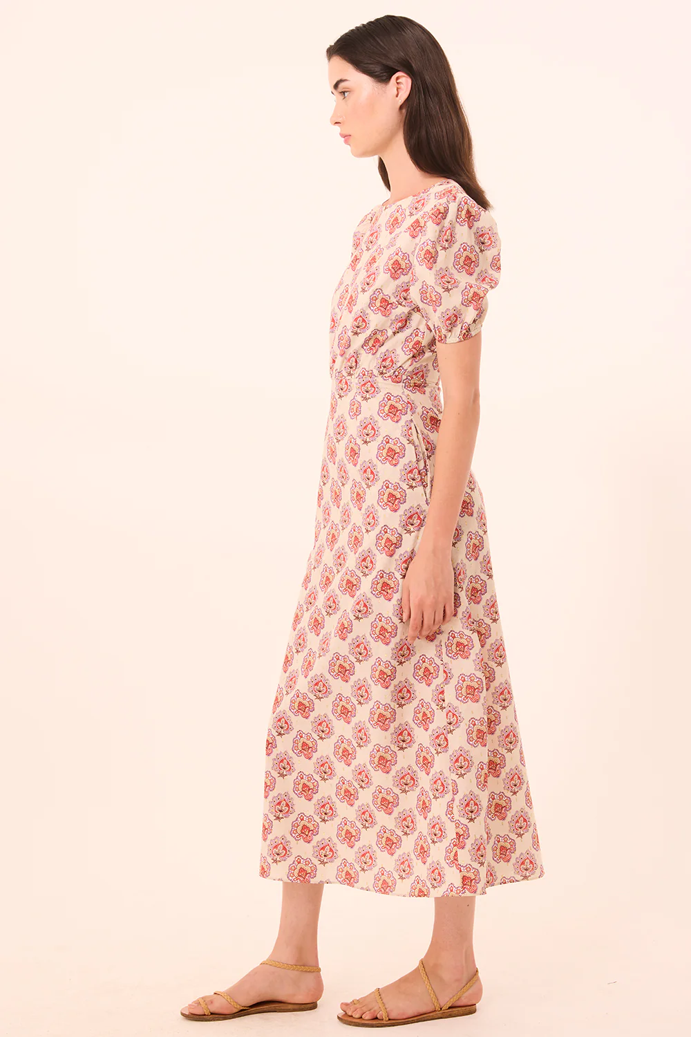Blanche is a new easy midi dress crafted from breezy cotton voile lurex dot fabric with an allover paisley block print. This effortless daytime silhouette features short puffed elastic sleeves, hidden side slit pockets, a high neckline, and flattering gathered detailing at the fitted waist. Finished with a hidden zip closure, it’s the perfect blend of simplicity and charm.