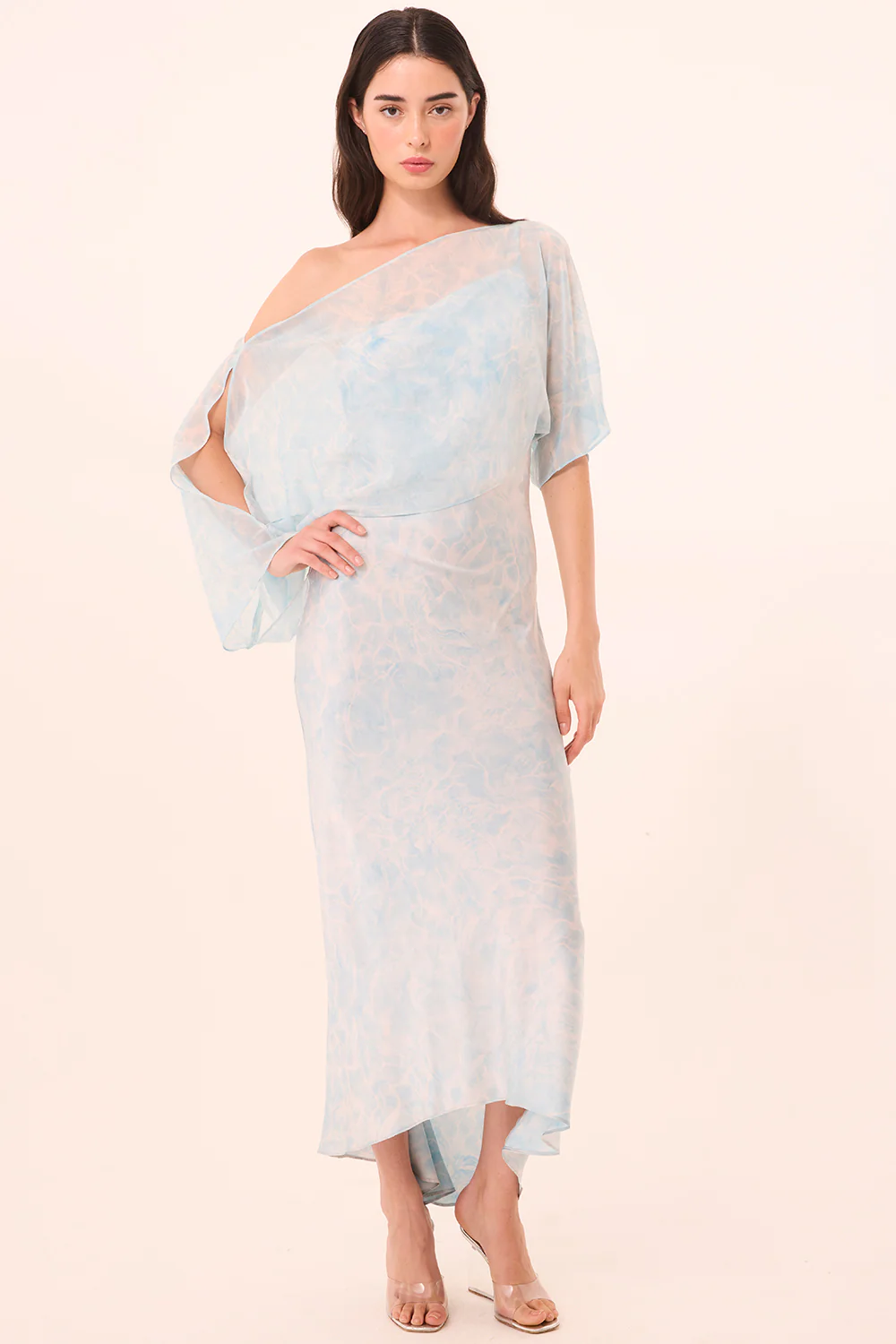 The Dalena dress is a sleek, figure-skimming maxi cut on the bias from our Acqua Blue–printed satin. This one-shoulder silhouette features a hidden side zip closure and an asymmetrical hem for added movement. For a dramatic styling option, it includes a detachable chiffon cape with an arm slit in the same print, designed to drape diagonally across the dress. A versatile piece that can be styled for everything from special occasions to elevated everyday moments.