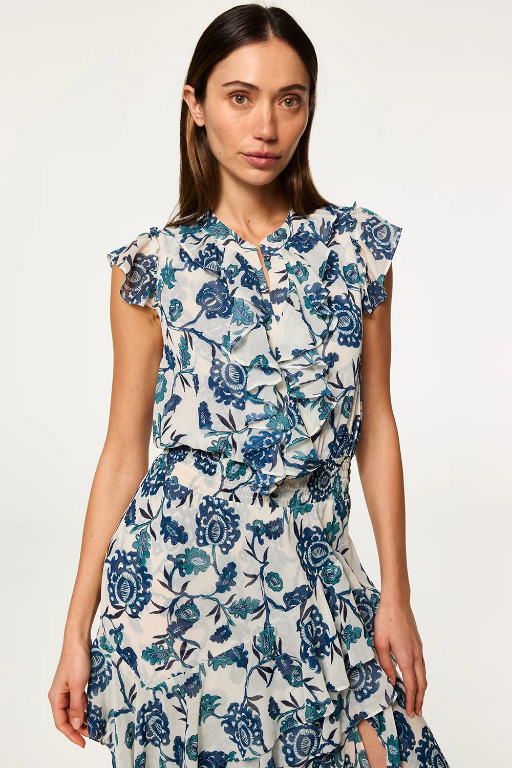 The Ilysa dress epitomizes effortless sophistication in a Teal Indigo Blooms print chiffon. Featuring ruffle-detailed cap sleeves to complement the ruffle trimmed placket with button closure. An elastic smocked waistband leads into a midi length asymmetric skirt with cascading ruffles and off-center side slit. This classic MISA silhouette will carry you through this season and beyond...
