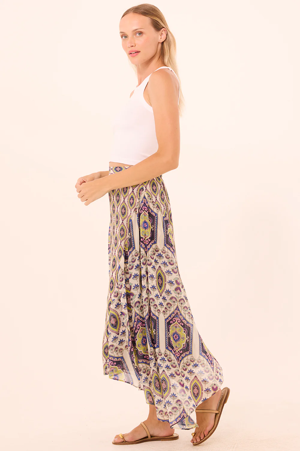 The Maral skirt is cut from our mosaic eye mix chiffon. This asymmetrical midi-length silhouette features a handkerchief hem in contrasting scales of the print, adding fluid movement throughout. Double self-lined for coverage, it’s finished with a flat banded front waist, a covered elastic back, and a hidden side zip closure. Pair it with the coordinating Bella top for a head-to-toe look, or dress it down with an easy white tank.